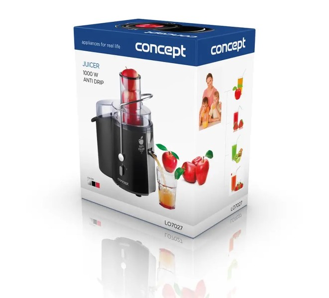 Odšťavovač Concept LO7027 s 1 000 W elektromotorom a 2 rýchlosťami zvládne odšťaviť aj tvrdšie ovocie. Sitko je nerezové, nádoba na šťavu, ktorá je súčasťou balenia, má 1 liter. Nádoba na odpad má kapacitu 1,8 litra. Prítomný je AntiDrip systém aj protišmykové nožičky.