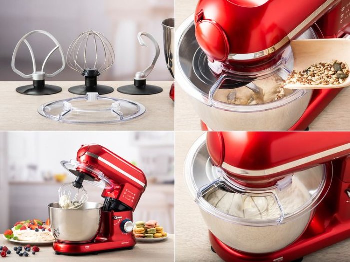 Príkon elektromotora: 1 400 W ● Počet rýchlostí: 6 ● Objem hlavnej nádoby: 4,5 l ● Hlavné funkcie: šľahanie, miesenie, miešanie ● Hmotnosť: - kg