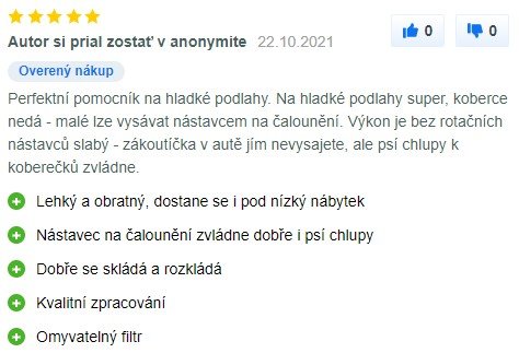Zákazníci kritizujú vyššiu cenu. Dyson je však touto cenovou politikou dobre známy. Odvďačí sa kvalitným spracovaním a spoľahlivosťou. Filtračný systém je účinný a vysávač je vhodný aj pre alergikov. Filter je umývateľný. Účinnosť vysávania je na veľmi dobrej úrovni. Ak hľadáte kompaktný a ľahký tyčový/ručný vysávač, vaše požiadavky tento model určite splní.