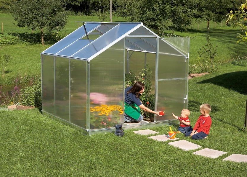 Polykarbonátový skleník so sedlovou strechou a hliníkovou konštrukciou, plocha 8,6 m2, strešné vetracie okno