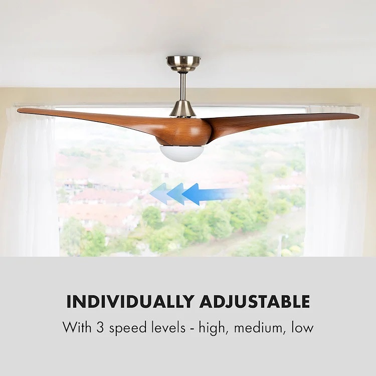 Ventilátor Klarstein Monteverde dokáže poskytnúť čerstvý vánok. Vzhľadom na to, že má menší výkon 41 W, hodí sa skôr do menších miestností. Vrtule s priemerom 52 palcov (132 cm) sa pohybujú v troch rýchlostiach. Na výber sme mali vysokú, strednú a nízku. Pri najvyššej rýchlosti dokáže dať prístroj do pohybu až 8 376 m³ vzduchu za hodinu. Hoci sú lopatky plastové, nepôsobia lacným dojmom, pretože verne imitujú drevo.